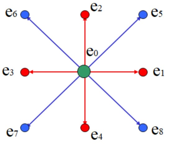 In this work, we used a two-dimensional formulation with nine local speeds at each computational node. This set of speeds, referred to as a lattice, must be carefully chosen to recover the Navier–Stokes equation. If the lattice vectors possess different modules, weighting factors need to be defined to achieve this goal. The number of dimensions and speeds defines a generic lattice. We chose the standard D2Q9 one, depicted in Figure 1, characterized by weighting factors .