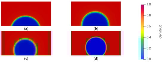 Figure 2 presents a 2D static water droplet surrounded by CO2 in the center of a rectangular domain with the size of 201 × 201 LU2, where the system’s temperature is 0.071 in LU. Here, as it gives good stability and is recommended in [], and the drop radius is 30 LU.