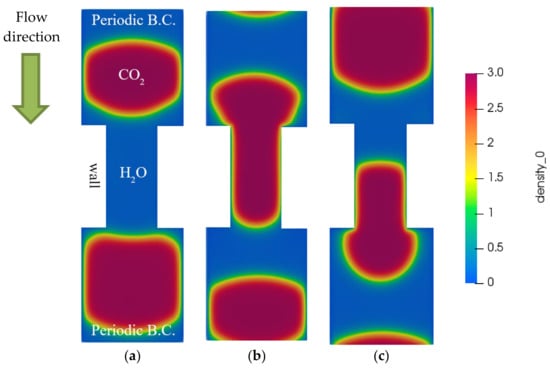 In this section, we analyze the performance of the multicomponent LBM model using the crossover PR EoS formulation in the visualization of the penetration of CO2 into an H2O-saturated 2D funneled channel that helps approximate the contractions in a pore network. CO2 is a non-wetting phase, and H2O is set as a wetting phase. The geometry of the domain is depicted in Figure 4a–c filled with immiscible H2O and CO2 fluids subject to a streamwise pressure gradient (body force) and inlet/outlet periodic boundary condition. The domain size is 41 × 151 LU2, and the channel is narrowed by placing two-block obstacles with a height of 40 LU and a width of 10 LU. Figure 4a also presents the initial condition with two large CO2 bubbles immersed in H2O and placed initially at the entrance and exit of the channel. H2O and CO2 fractions are 0.61 and 0.39, respectively, and the system’s temperature is 0.071 in LU.