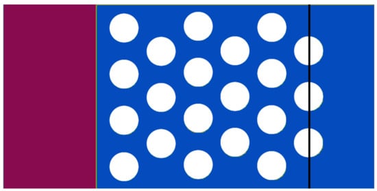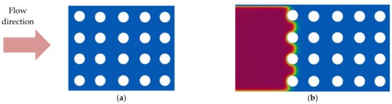 The modeling CO2 penetration into a 2D porous media under different body forces was also studied using the crossover PR EoS formulation embedded in the multicomponent LBM. The porous media is constructed by placing several previously saturated cylinders with H2O. The schematic diagram of the porous region is shown in Figure 7a, which has a porosity of 0.78 and a pore throat of 10 LU. The domain size is 191 × 81 LU2, with the horizontal length of the pore network being 90 LU. Top and bottom walls are set as a no-slip boundary condition, while both left and right sides are set as periodic. The computational domain is subject to a streamwise pressure gradient to drive the CO2 into the porous medium saturated with H2O (wettable fluid) with a contact angle of 70°. The density ratio is set to 1, and the system’s temperature is 0.071 in LU. Figure 7b presents the case with body force 2.5 × 10−5 at 113,400 ts. In this case, the driving force is not enough to overcome the capillary resistance.