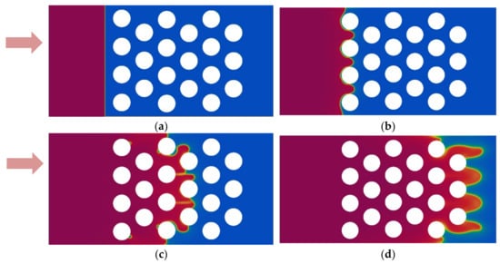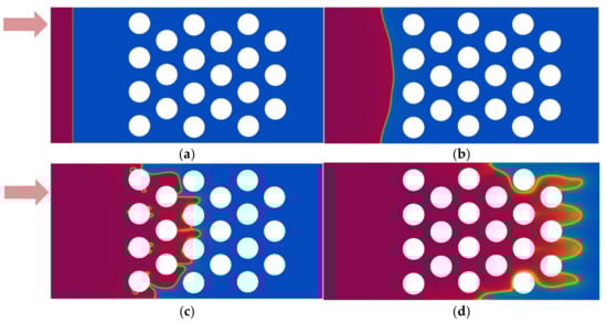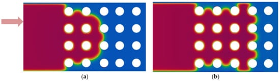 Next, we compare the effect of the front profile of the intruding fluid (CO2). According to Fakhari et al. [], the distance from the inlet to the porous section of the micromodel has a significant effect on numerical simulations. The parabolic velocity profile better matches the initial conditions between the numerical simulations and experiments. To achieve a parabolic profile, we extended the length of the inlet region to 85 LU. To observe the effect of the front shape of intruding fluid on displacement patterns, we also placed the inlet region closer to the pore network at 7 LU from the first row. The initial conditions for both cases are shown in Figure 9a and Figure 10a. In both cases, the overall domain size is 401 × 201 LU2, with the pore network length of 229 LU in the streamwise direction. The inlet velocity is 0.02 LU/ts as proposed by Zou and He [], applied on the left bound of the domain (inlet), and the outflow boundary condition is applied on the right end. Both top and bottom walls are set as a no-slip boundary condition, and the contact angle is set to 85°. The density ratio is again set to 1, and the system’s temperature is 0.071 in LU.