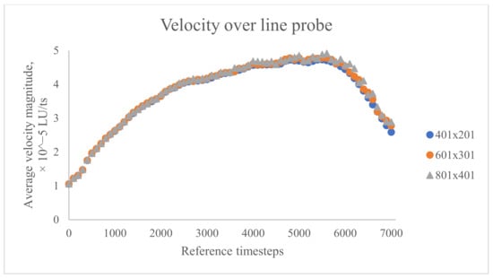 A grid-independence analysis is developed by introducing two more refined models of 601 × 301 LU2 and 801 × 401 LU2, with geometry, inlet speed, viscosity, and timestep span scaled accordingly. The average velocity magnitude along a line drawn over the last row of obstacles, as shown in Figure 11, was utilized as a comparison parameter for the three grid sizes. Results of the velocity probe are shown in Figure 12, taken from lattice time of 0 to 7100.
