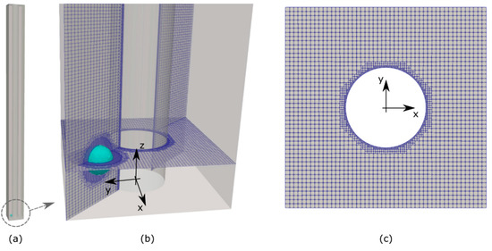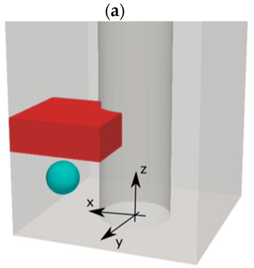 Adaptive mesh refinement was utilized in order to provide sufficient resolution to the flow, while maintaining a coarse mesh far from the bubble. The background mesh is composed of cubic hexahedra (see Figure 4b,c) with two recursive levels of refinement nearby the rod surface, where the control volumes are clipped to fit the cylindrical surface. The mesh is dynamically refined at the bubble interface during runtime up to the maximum level of refinements selected, and the same criterion is also applied to the initial mesh at time , as can be observed in Figure 4b. The requirements in terms of mesh resolution for the rise of bubbles in stagnant liquid is usually expressed in cells per bubble diameter. Hua et al. [33], Dijkhuizen et al. [34], and Roghair et al. [35] performed direct numerical simulations of air bubbles rising in an infinite pool of stagnant water for Reynolds numbers up to 103 [34,35] and 104 [33], employing 20 cells per bubble diameter. Loisy et al. [37], Balcázar et al. [38], and Esmaeli and Tryggvason [39] studied the rise of bubbles in the spherical and ellipsoidal regime for Reynolds numbers up to 100 with 25–30 cells per bubble diameter. Cano-Lozano et al. [40], Tripathi et al. [41], and Gumulya et al. [42] analyzed bubble shapes and trajectories for Reynolds numbers up to 100 employing adaptive mesh refinement with resolutions of 128 [40], 82 [41] and up to 220 [42] cells per bubble diameter at the liquid–gas interface. Gumulya et al. [36] simulated the rise of air bubbles in stagnant water for Reynolds numbers up to 103 using adaptive mesh refinement with up to 220 cells/diameter at the bubble interface.