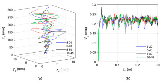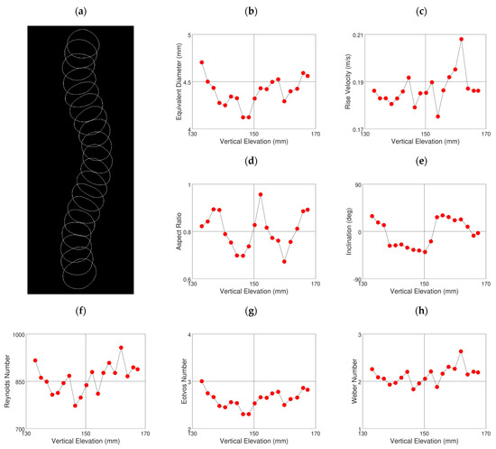 where is the vertical elevation of the centroid of the bubble and is the time elapsed between successive frames (note that, strictly speaking, Equation (3) is exact only in the limit of ; in the present case, however, is small enough to make the approximation acceptable).