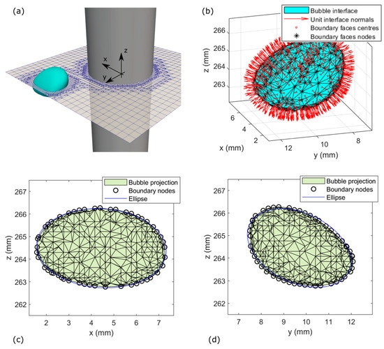 From the numerical simulations, bubble interface data are extracted during runtime with regular temporal frequency, typically every , ensuring about 300 frames for each run. Figure 6a shows a snapshot of the bubble during the rise for the case, run with the coarsest (5–20) mesh. The points representing the liquid–gas interface are identified as the iso-surface. This list of points is read in Matlab (version R2018b) and the built-in function alphaShape is utilized to create a bounding volume enveloping these points, enabling the calculation of geometrical quantities such as bubble surface area and volume. Further topological queries such as the extraction of centers, nodes and normal vectors of the boundary facets can be addressed with the function triangulation, as illustrated in Figure 6b. In order to characterize the geometry of the bubble, this is modelled using two-dimensional ellipses and three-dimensional ellipsoids. From the list of interface points, the bubble projections on the xz- and yz-planes are first obtained. Then, for each projection the boundary nodes are extracted and utilized to fit a two-dimensional ellipse [43] as shown in Figure 6c,d. From the fit, the ellipse axes lengths and aspect ratio are calculated. A different function is used to fit a three-dimensional ellipsoid [44] to the interface points and calculate axes lengths and aspect ratios. This procedure is repeated for all the saved bubble interface data, to finely resolve the bubble dynamics over time.