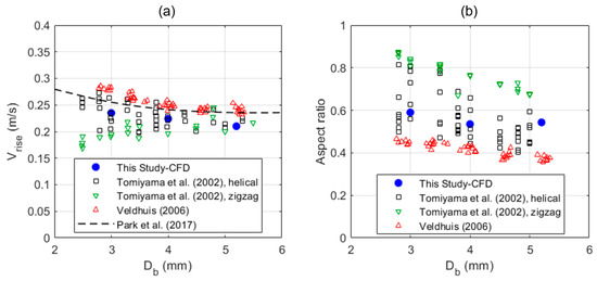 Validation of the numerical model versus the experimental data of Tomiyama et al. [17] and Veldhuis [47]: (a) bubble rise velocity and (b) aspect ratio versus bubble diameter. The black dashed line in (a) indicates the bubble rise speed predicted using Park et al. [48] correlation.