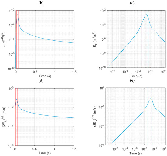 (a) View of the control volume (in red) used in the calculation of the kinetic energy of the water during bubble rise (), with the blue sphere depicting the bubble at ; time variation of the kinetic energy of the water inside the control volume in linear (b) and logarithmic (c) scale; time variation of the mean velocity (computed as the square root of the kinetic energy) of the water inside the control volume in linear (d) and logarithmic (e) scale. The red vertical lines mark the times the bubble enters (leftmost red line) and leaves (rightmost red line) the control volume.