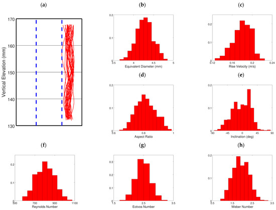 Instantaneous dynamic of all measured bubbles: (a) rise trajectories of the centroid of the bubble projections extracted from consecutive images (the vertical dashed lines in blue color denote the position of the rod), and histograms of the corresponding instantaneous variations of the bubble equivalent diameter (b), rise velocity (c), aspect ratio (d) and inclination (e) of the equivalent ellipse, and Reynolds (f), Eötvös (g) and Weber (h) number values.