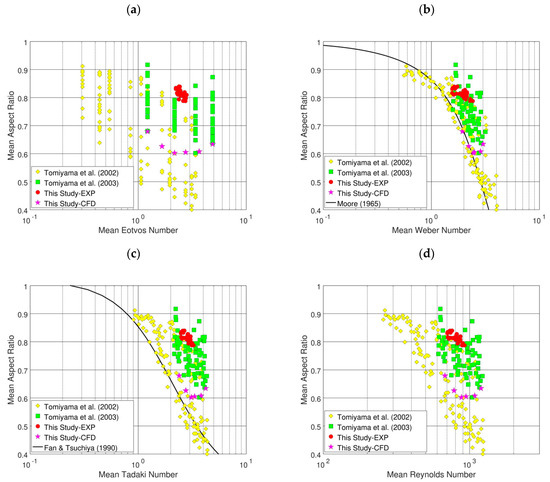 The rise velocity corresponding to the drag coefficient from Equation (24) and the drag coefficients corresponding to the rise velocities from Equations (25) and (26) were computed according to Equation (19). The data provided by Venkateswararao et al. [14] are not included in Figure 17c,d because the authors did not measure the shape of the bubbles (the bubble aspect ratio is needed as an input to Equation (25)).