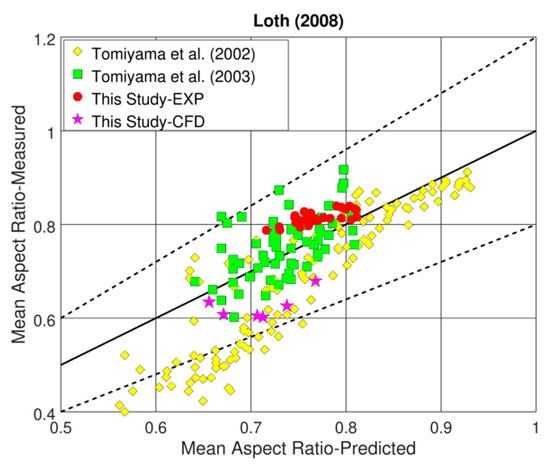 Finally, the present measurements and CFD simulations, together with the data of Venkateswararao et al. (1982) [14] and Tomiyama et al. (2003) [15], are compared in the parity plots in Figure 17, with the prediction methods proposed by Tomiyama et al. [56], Equation (24); Tomiyama et al. [17], Equation (25); and Rodrigue [57], Equations (26)–(27):