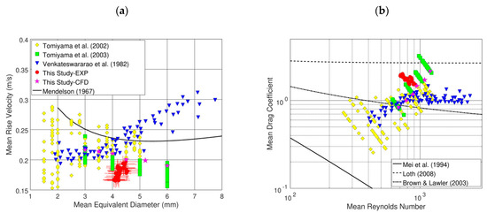 The data are also presented in Figure 15b as the mean drag coefficient versus mean Reynolds number. Following common practice, the mean drag coefficient and mean rise velocity were linked through a steady-state force balance between drag and buoyancy: