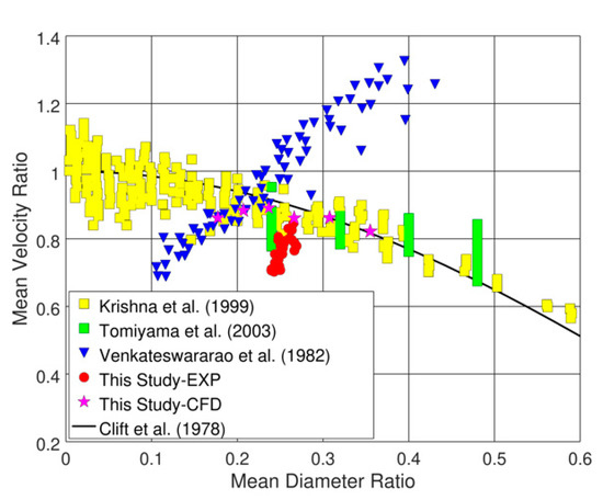 where is the diameter of the confining circular tube. On the right-hand side of Equation (23), the square root term corresponds to the Mendelson [53] prediction method in Equation (17) for bubbles rising through unconfined liquids, whilst the multiplying term is a correction proposed by Clift et al. [1] that accounts for the confinement. In Figure 16, the velocity from measurements or CFD simulations is divided by the unconfined rise velocity predicted from Equation (17), and then the velocity ratio is plotted as a function of the diameter ratio . For the present measurements and CFD simulations the hydraulic diameter was used in place of the tube diameter , whilst for the data of Venkateswararao et al. [14] and of Tomiyama et al. [15] the inner subchannel hydraulic diameter was used (as carried out by Tomiyama et al. [15]). The solid line in Figure 16 corresponds to the above confinement correction by Clift et al. [1]. The data by Krishna et al. [6], which refer to air bubbles at ambient conditions rising through confined water in circular tubes, are also included in Figure 16 for comparison with the non-circular channel data.