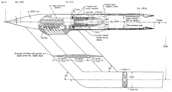 The nozzle geometry and working conditions simulated in the present numerical study are derived from the experimental testing carried out at Nasa LaRC by Carlson and Lee []. In that work, five models of an axisymmetric, convergent-divergent nozzle with circular-arc throat contour and conical divergent sections were investigated experimentally. The nozzle geometries refer to different configurations of the variable-geometry axisymmetric nozzle designed for a supersonic cruise aircraft equipped with a variable-cycle engine. The five configurations represent the nozzle setup for different flight conditions and power settings ranging from a subsonic cruise, dry power configuration, characterized by a low expansion ratio and a high nozzle boattail angle, to supersonic acceleration, with maximum afterburning, having a high expansion ratio and a low nozzle boattail angle. The experimental investigations were conducted at nozzle pressure ratios (npr) from jet-off to about npr and for freestream Mach numbers ranging from 0.60 to 1.30. A detailed description of the nozzle geometries and testing conditions is given in Ref. []. Numerical simulations of the flow are also available for comparison [,]. The nozzles were attached to an axisymmetric nacelle with a forebody. The general arrangement of the nacelle model and support system is shown in Figure 1. Nozzle Configuration 2 (Conf-2) of Ref. [] has been selected for the numerical tests reported here. The configuration corresponds to the supersonic cruise setting in dry condition, that is, without afterburning. The adaptation pressure ratio of the nozzle in Conf-2 is npr. Nozzle geometry and relevant design parameters are presented in Figure 2.