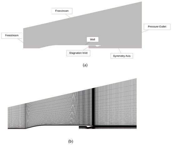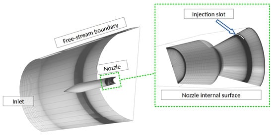 The domain geometry is chosen in such a way to capture the relevant interactions between the free flowing air and the forebody, as well as interactions between the external flow and the nozzle jet. The computational domain consists of a mesh of about 170 k quadrangular elements for the 2D axisymmetric analysis, whereas for 3D calculations, a grid of about 3.5 M cells has been generated by revolution around the symmetry axis. The boundary conditions for the problem were chosen according to the nature of the flow and the available experimental information. For the external flow inlet, a free-stream boundary condition has been used to impose Mach number, pressure and temperature. A pressure outlet boundary is utilized to impose an outflow condition with specified static ambient pressure, while values for velocity or temperature are extrapolated from the interior of the domain. A total inlet condition is adopted for the nozzle flow, in order to prescribe values of total pressure and total temperature for the jet, whereas for the injection of the secondary flow, a mass flow rate boundary condition has been used. For solid surfaces a no-slip wall condition is utilized. For the 2D domain a symmetry axis has been prescribed in order to perform the axisymmetric simulations, whereas for the 3D simulation a symmetry plane condition is utilized to account for the other half of the physical domain. A representation of the computational grid and a visualization of the boundaries can be found in Figure 3.