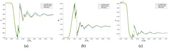 Temperature (a), Mach number (b) and pressure (c) distributions along the nozzle axis of symmetry at different grid levels (coarse mesh = 73 k cells; medium mesh = 170 k cells; fine mesh = 325 k cells).