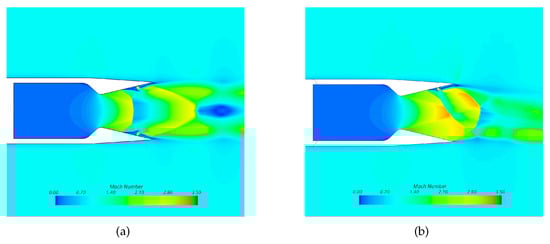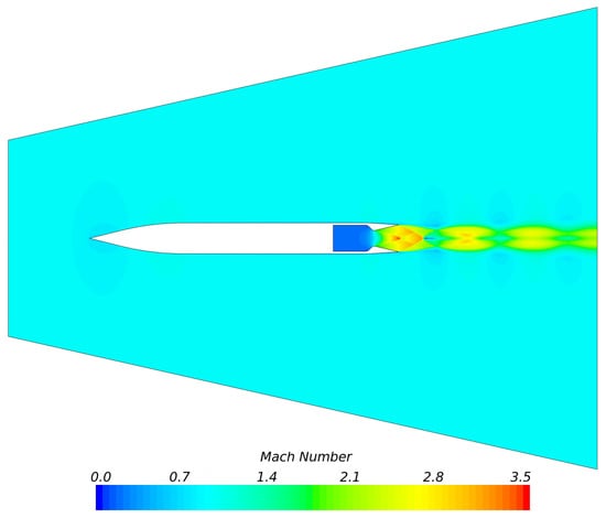 A full view of the simulated flowfield inside and around the nozzle system is presented in Figure 5. This flowfield represents a typical nozzle off-design condition of interest. The nozzle is over-expanded (the pressure ratio is npr ) at high transonic flight (). As is visible, an adequate resolution of the nozzle plume is obtained and no significant flow perturbations arise from or reach the boundaries, other than the jet flow. Moreover, the interference generated by the forebody does not propagate up to the nozzle region. Therefore, the jet flow issuing from the nozzle is influenced only by the external pressure and by the flow conditions in the aft-body region in general.