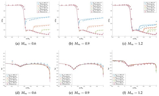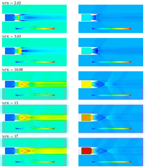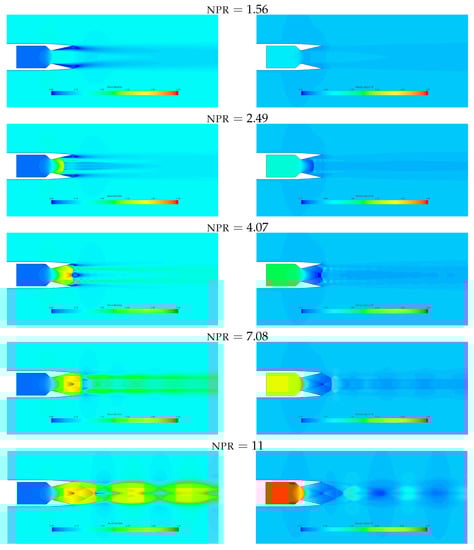 The results of the complete sets of simulations at = 0.6, = 0.9 and = 1.2 are presented in Figure 6, Figure 7 and Figure 8, respectively. For each pressure ratio, the flowfield is represented in terms of both Mach number and density contour maps. The nprs values are not the same for each flight mach number in order to adhere to that reported in the experiments []. In all these figures, the different levels of nozzle over-expansion, its effect of the shock induced separation and on the mach disk position is clearly visible. Focusing on Figure 6, once the nozzle flow becomes supersonic, shock structures begin to form, as is already visible for npr , where oblique shock waves and the Mach disk are first generated. As the npr is increased, the region of separated flow shrinks in size, the Mach disk is shifted forward, and wave reflections become more visible. For even higher npr, supersonic shocks and reflections become increasingly distinguishable in the jet plume too. The density field follows the same considerations, but its values mirror those of the Mach field, decreasing during expansions where the Mach number increases and vice versa through shocks. Very similar results are obtained for external Mach numbers and , as illustrated in Figure 7 and Figure 8.