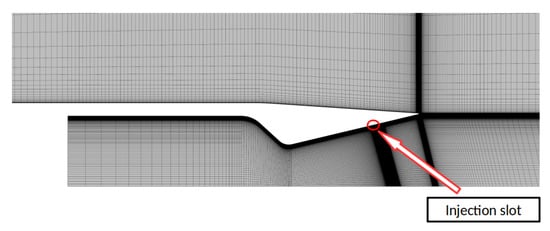 In this section, a study of the flow forcing effectiveness is carried out for identifying an adequate location of the secondary massflow injection point required for the SVC based thrust vectoring. Obviously, under the axisymmetric flow assumption, we do not expect any jet flow deflection. It was assumed, anyway, that the flow forcing may produce local effects that are similar in the axisymmetric and fully three-dimensional case. It is well-known that the SVC technique depends on a flow structure generated by the interaction between the secondary blowing, normal to the wall, and the main flow. In the supersonic region upwind the flow injection a fluid ramp is formed and an oblique shock is generated [,]. We are interested in the numerical estimation of parameters such as the shock distance from the injection slot and the shock inclination, in order to rapidly assess the effects on the main flow and to identify a suitable position of the injection slot for the more costly 3D simulations. Naturally, multiple parameters other than the position of the slot alone can influence the effect of the injection on the main flow and its structures; for instance, the secondary mass flow ratio and the opening area have been shown to have a direct influence on the deflection of the flow []. In this preliminary analysis, the secondary mass flow-rate has been kept constant and equal to 3% of the main mass flow-rate, while the injection slot area in the axisymmetric case is naturally the lateral surface of a truncated cone. The resulting mass flux per unit area is thus considerably smaller than that in the case of a secondary injection of the same mass flow-rate through a reduced area. The opening has been sequentially positioned at 70%, 80% and 90% of the length of the diverging part of the nozzle until the position of the fluidic ramp that would be generated was considered satisfactory for the subsequent fully three-dimensional analysis. The modification of the grid close to the injection slot and the required grid refinement are shown in Figure 10.
