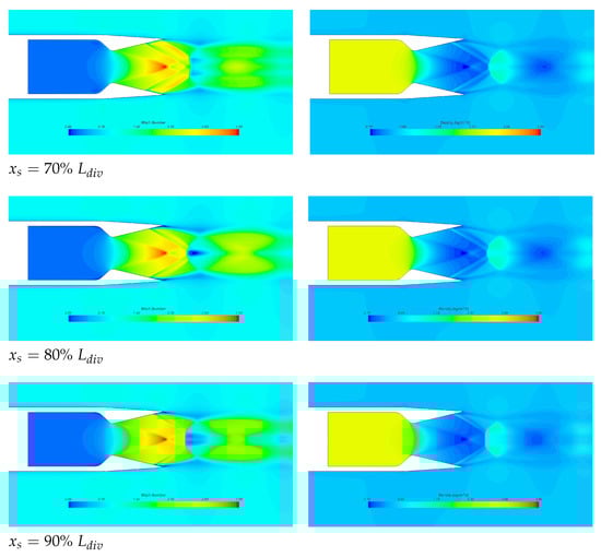Mach number (left) and density (right) fields for axisymmetric injection at different positions in the nozzle divergent.