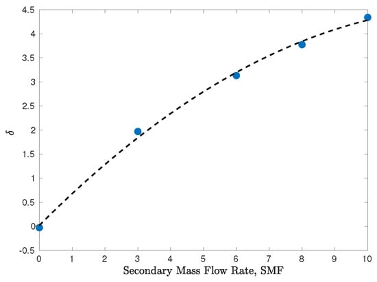 In this section, the analysis based on the fully three-dimensional numerical simulations of the nozzle under SVC forcing is discussed. In previous SVC vectored nozzle studies [,,,] performances are analyzed and characterized by varying the npr and the secondary mass flow ratio smf for a jet-flow efflux in calm air. External flow interactions have been accounted for mainly by CFD approaches in two dimensions []. In Section 4.2, the NASA test-case on boat-tail nozzle flow has been used for validating the numerical tools and a good agreement for the simulations of the interaction between the nozzle plume and the external flow has been obtained for the case of co-flowing streams at different asymptotic Mach numbers . Now, we follow the same path and numerically analyze the SVC effects of secondary mass flow injection on the nozzle side force, also in the presence of an external flow. In particular, at this stage, we focused on the study of the effectiveness of the FTV for different levels of forcing, based on different smf values, at the nozzle pressure ratio npr and with an external flow Mach number .