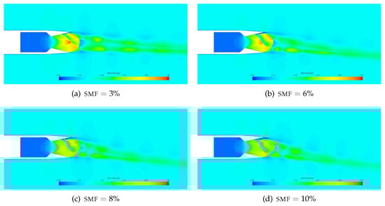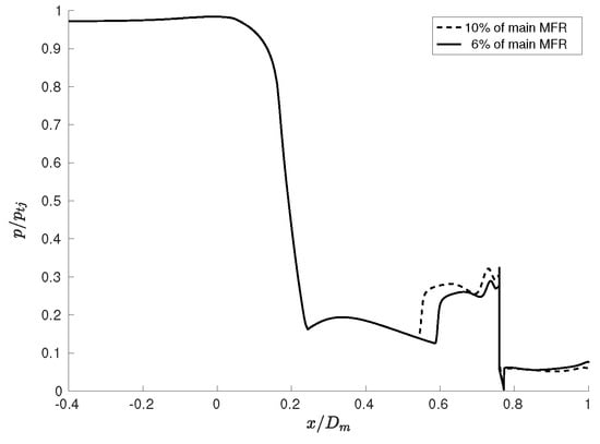 The plot of Figure 14 shows that the increase of secondary mass flow rate induces a nonlinear increase in the value of , up to about for smf , following an almost parabolic curve []. As a consequence, the lateral force rises as well, increasing from 3.5% to about 7.5% of the axial force component, . At the same time, the axial force component is reduced with respect to the symmetric condition of just about 3%, passing from about 1280 N for smf to 1245 N for smf = 10%. The increase in lateral force is due to the separation induced by the injection of the secondary flow, which in turn generates a separation zone on the nozzle walls, thus changing the pressure distribution as is well highlighted in Figure 15 for the 6% and 10 % of secondary mass flow cases. Such separation is shown in Figure 16, where it is very clear that a fluidic ramp is formed ahead of the injection point, generating an oblique shock that induces the flow to separate, changing the pressure distribution and generating a force imbalance, (). Naturally, the separation zone increases as the smf rises; however, this phenomenon does not seem to overly affect the axial force (). This last consideration gives us expectation that the method can be applied efficiently to vector the thrust of propulsion systems.
