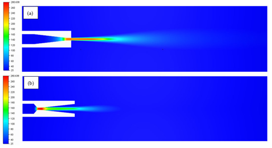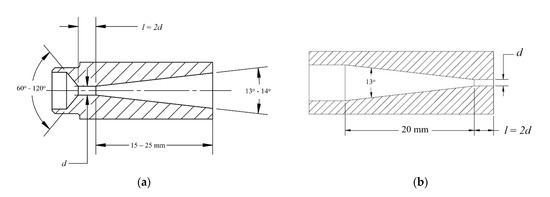 After slight adjustments of parameters and a preliminary CFD study, the following parameters were selected for the nozzles (Figure 1a): the inlet cone angle was 100°, the throat diameter was 1.5 mm and the outlet cone angle was 13° with length 20 mm. For the conical hydrodynamic nozzles, similar parameters were selected: the inlet cone angle was 13° with length 20 mm and the diameter of the throat was 1.5 mm.