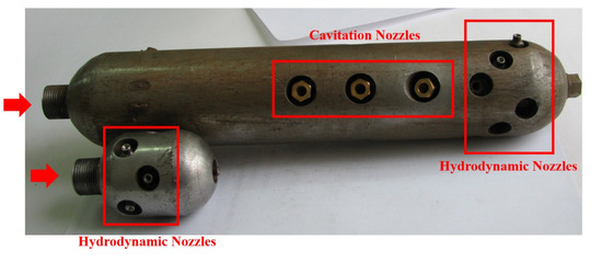 In this study, sets of hydrodynamic cavitation generators are proposed and used in combination with common conic nozzles to improve hydrodynamic well cleaning. Cavitation is a process of formation of vapor bubbles in the regions of the liquid where the pressure drops below the vapor pressure of the liquid. When these bubbles move to regions of higher pressure they start to collapse. This collapsing process involves the appearance of shock waves and high-speed microjets near the wall, and a local increase in temperature and pressure. This process leads to the so-called cavitation erosion of pipelines and hydraulic equipment [10,11,12]. In high-speed hydrodynamic jets, cavitation starts in the low-pressure cores of turbulent vortices in the mixing layer [13]. A special design of nozzles is used to condition the jet’s shear zone to enhance cavitation and increase the erosion capacity. A detailed review of the various applications of cavitation jets in the oil and gas industry and the parameters that affect their performance can be found in [14]. Cavitation can significantly increase the jet’s cleaning properties and improve existing methods of high-pressure cleaning [15,16,17] by reducing the operational pressure and flow rate.