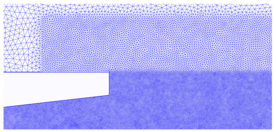 This method is used directly on the diffusion and source terms. However, for numerical stability, the advection terms are treated with upwind methods along with the weighted integral method. We used one of the variations of the Petrov–Galerkin method as an upwind method. The magnified mesh structure is shown in Figure 3. The only option in this package for the element geometry in 2D is a triangular geometry.