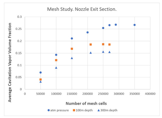 Mesh study. Average cavitation vapor volume fraction at the nozzle exit.