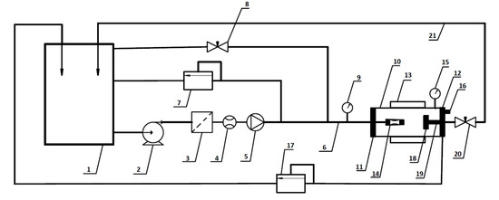 Experimental setup. 1: Water tank; 2: centrifugal booster pump; 3: filter (5 μm); 4: flowmeter; 5: plunger pump; 6: high-pressure hose; 7,17: safety valves; 8,20: needle valves; 9,15: Bourdon tube pressure gauges; 10: test chamber; 11,12: lids; 13: sight glass: 14: nozzle; 16: microphone; 18: test plate; 19: holder; 21: return line.