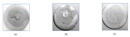 Typical cavitation erosion patterns were observed in all three cases. The patterns of erosion were different. In case (a) we can observe a ring-shaped pattern with a central part corresponding to the jet impingement region. In this case, cavitation bubbles were carried out by the vortex rings and thus collapsed further from the center. Case (b) is similar; the impact region is observed in the center but the pattern is not circular. This could be related to the non-symmetric development of cavitation inside the nozzle or the deformation of the vortex ring as it advects downstream [23,24,25]. In case (c), it can be seen that cavitation bubbles were collapsing in the center, which could mean that the effect of impingement was smaller and cavitation bubbles were not carried along the wall by the vortex rings. These results show that the designed cavitation nozzles were efficient at water depths up to 300 m, and bubbles would collapse on the water wells’ walls producing a significant cleaning effect.