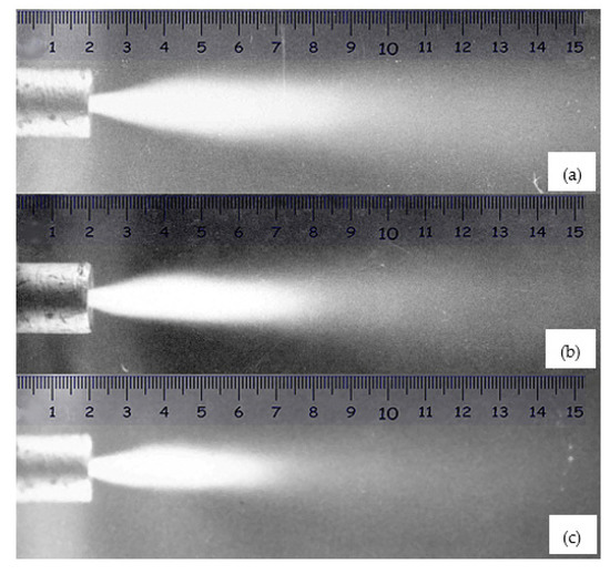 Cavitating jet inside the test chamber. Pin = 300 atm: (a) Pout = 0 (gauge), (b) Pout = 10 atm (gauge), (c) Pout = 30 atm (gauge).