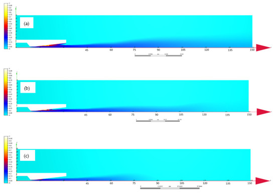 It can be seen that in the first two cases, the cavitation zone propagated through the entire domain, and in the last case it propagated up to 87 mm; therefore, this nozzle can effectively produce cavitation in well depths up to 300 m. It is also shown that cavitation clouds are formed inside the nozzle; they continue developing downstream and then expand. The experimental results presented in [21] demonstrate that cavitation jets consist of three zones: growing, shedding and collapsing. When a cavitation cloud propagating from a nozzle reaches a specific location, the downstream part is shed from the initial cloud. After the shedding, the cavitation cloud starts to collapse.