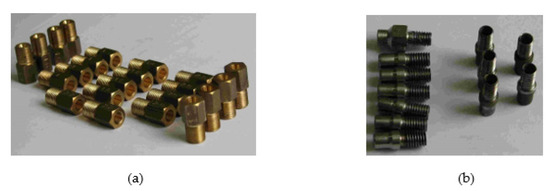 Sets of nozzles ready for well cleaning. (a) Cavitation nozzles, (b) hydrodynamic conic nozzles.