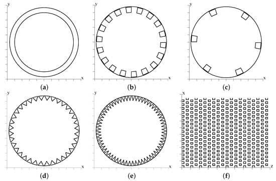 Sketch of roughness geometries in a cross-stream plane with and : (a) ; (b) ; (c) ; (d) ; (e) ; (f) the geometry is depicted in a ( and ) shell at the plane of the crests.