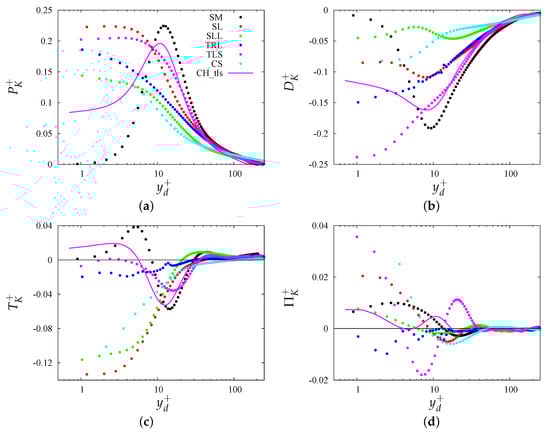 Terms in the turbulence kinetic energy budget (Equation (2)): (a) production (), (b) total dissipation (), (c) turbulent transport (), and (d) pressure transport (), for the corrugations given in the legend of panel (a). refers to data for the geometry in channel flow.