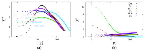 In the case of rough surfaces, the production term is approximately constant in a thin layer near the plane of the crests, with values between and , which do not differ much from the smooth wall case. Hence, it may be stated that proportionality between production and friction holds. For instance, the peak production for the case would be a factor twenty higher than the smooth case, which is close to the ratio of the scaling factors () for the two surfaces. For the geometry, production is times that of the smooth case, again close to the ratio between the scaling factors. For the other types of corrugations, the occurrence of similar values of implies that the maximum production at the plane of the crests equals the peak value in the smooth case. For the geometry, the different behavior of production in pipe (solid magenta circle), and channels flow (solid magenta line) allows for understanding drag reduction in the channel. In fact, , and in pipe at the plane of the crests, we have , whereas in the channel flow (see Table 1 in Orlandi [14]), one has . In addition, the maximum of does not occur at the plane of the crests for the channel. To be more clear, drag reduction is achieved when the velocities at the plane of the crests reduce more than the increase of . This effect was investigated in detail by DiGiorgio et al. [31].