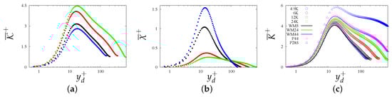 The incoherent production term as defined in Equation (8) accounts for interaction between the velocity gradients associated with large flow scales, and the fluctuating velocity correlations associated with small turbulence scales. For rough walls, the overall production term (red in Figure 9) is different from the case of smooth walls, and it strongly depends on the geometry of wall corrugation, with coherent and incoherent contributions having much different relative importance. Similarity of coherent and incoherent contributions to production implies similarity of the shape of the wall structures, which however differ in strength, as seen in Figure 7c,d. The relative magnitude of the coherent and incoherent production for triangular bars (, see Figure 9dc) is similar to the smooth case (see Figure 9da). However, their profiles differ, as for in the smooth case has peak at , and it is zero at the wall, whereas, in the corrugations, the peak occurs near the plane of the crests, in agreement with the visualizations in Figure 7h. The production term for staggered cubes corrugations is similar and smaller than for the triangular bars, but the coherent contribution is negligible for . In the case of the corrugations (Figure 9db), coherent and incoherent production have opposite signs, the former being larger than the latter in magnitude.