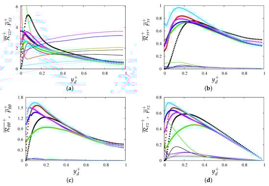 Profiles of incoherent stresses (symbols)(, and of the coherent stresses (lines) in wall units versus distance from the plane of the crests, for the corrugations indicated in the legend of Figure 4b: (a) axial, (b) radial, (c) azimuthal, and (d) shear stress.