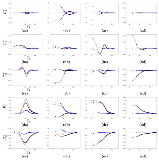 Turbulence kinetic energy budgets for smooth pipe (, panels aa,ba,ca,da,ea); rectangular bars (, panels ab,bb,cb,db,eb); triangular bars (, panels ac,bc,cc,dc,ec); and staggered cubes (, panels ad,bd,cd,dd,ed). Convection terms: panels aa–ad; pressure-velocity turbulent: panels ba–bd; turbulent diffusion: panels ca–cd; production: panels da–dd; total dissipation: panels ea–ed. The red lines denote terms in Equation (2); blue and black lines denote coherent and incoherent contributions in Equation (6), and open circles their sum.