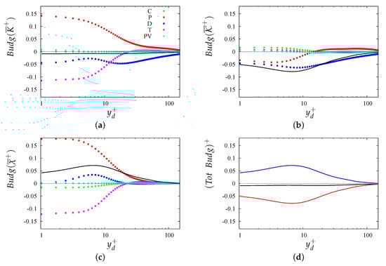 The condition sets the convective term to zero. The turbulent transfer term accounts for the triple velocity correlations, for the pressure–velocity gradient correlations, is the production term and is the total dissipation. Note that here the latter term is not split into viscous diffusion and isotropic dissipation, as traditionally done. Orlandi [14] pointed out that this simplification may lead to advantages in RANS closures for flows past smooth and rough walls. Qualitative comparison between the budgets in Figure 12 of Orlandi [14] for channels and those in Figure 3 shows similar trends, with the exception of the geometry, which in the case of channels yields slight drag reduction, whereas here it yields a slight drag increase.