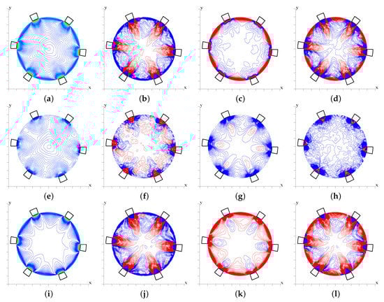 Regarding the cubic obstacles (), which yield the largest flow resistance, Figure 6a showed strong reduction of the coherent and incoherent axial stresses, which comes with absence of yellow and red contour levels in Figure 7m,n. On the other hand, Figure 7p shows accumulation of the incoherent shear stress in regions having the same size as the cubes. Their large values at the plane of the crests implies that the high resistance is mainly due to the incoherent shear stresses. It should be recalled that, in Figure 7, stresses are expressed in wall units, and the value of for corrugations is approximately two times higher than for the other corrugations. Returning to the case of the longitudinal square bars, we have noted that increased coherence is due to organized wall-normal disturbances taking place near the walls of the cavity. For the corrugations, the disturbances are so strong as to generate wall structures larger than the height of the bars (Figure 7j,l). Similar figures for the corrugations (not reported) indicate that disturbances normal to the wall affect a layer of thickness near the plane of the crests. The distributions of the stresses for are similar to those in the smooth pipe. For triangular bars, wall-normal disturbances reduce in amplitude, and the wall structures are similar to those found in the smooth case.