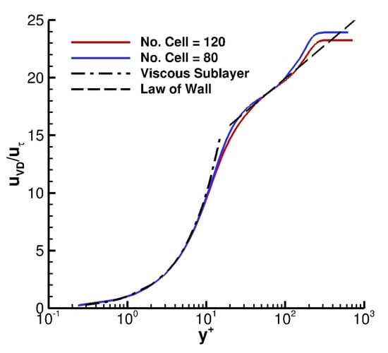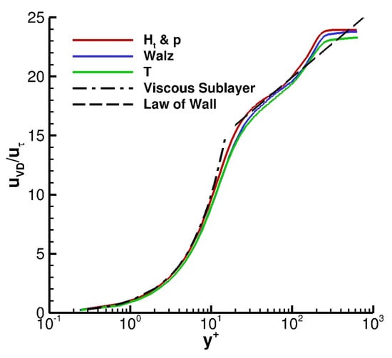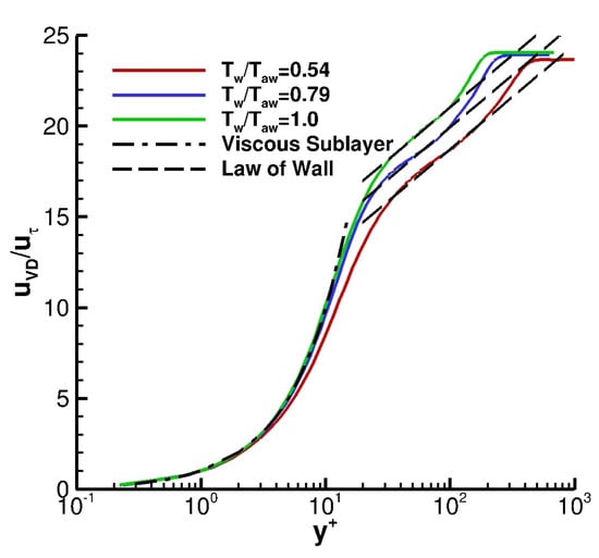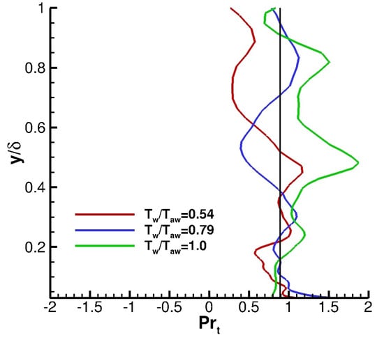 - Trettel, A.; Larsson, J. Mean Velocity Scaling for Compressible Wall Turbulence with Heat Transfer. Phys. Fluids 2016, 28, 026102. [Google Scholar] [CrossRef]