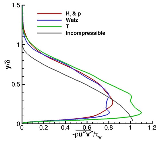 Figure 6 presents the calculated Morkovin scaled dimensionless turbulent shear stress () by the three recycling-rescaling methods at . Additionally, for comparison purposes, the incompressible shear stress data of Klebanoff [] is also presented. The predicted Morkovin scaled dimensionless turbulent shear stresses are in general agreement with the incompressible data although the region with non-zero turbulent shear stress is smaller in the incompressible data. The Morkovin scaled dimensionless turbulent shear stress is zero at the wall, increases to its maximum value of about one at some distance near the wall and then reduces to zero at the edge of the boundary layer. The Walz and methods predict the same maximum turbulent shear stress while the T method predicts a larger maximum shear stress.