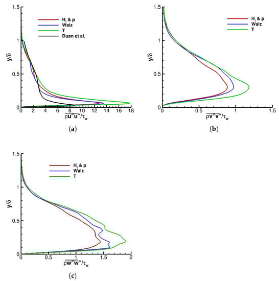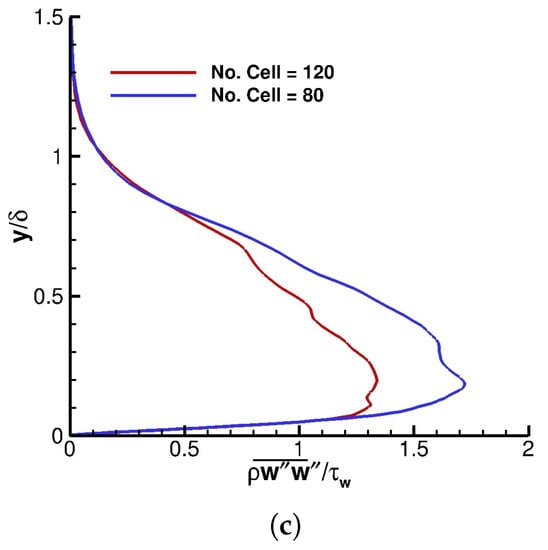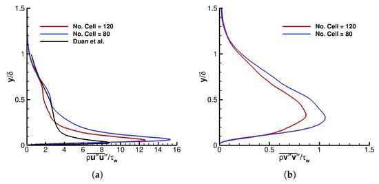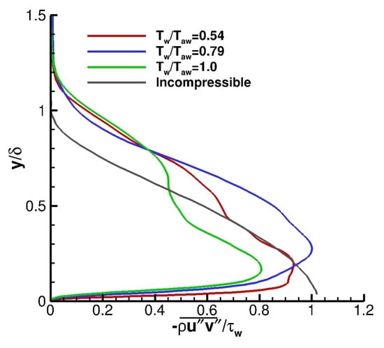 The comparison of the predicted Morkovin scaled dimensionless turbulent streamwise stress with the DNS results of Duan et al. [] shows a general agreement; however, the maximum stress is smaller for Duan et al. Further investigation is required to understand the reason behind this. It should be mentioned here that for the presented result of Duan et al. is 0.68 while in our case, is 0.79.