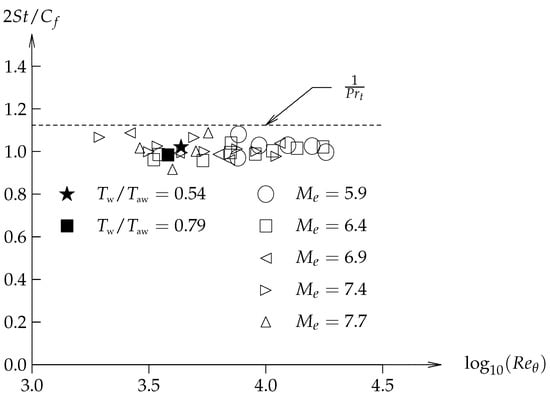 - Keener, E.; Polek, T. Measurements of Reynolds Analogy for a Hypersonic Turbulent Boundary Layer on a Nonadiabatic Flat Plate. AIAA J. 1972, 10, 845–846. [Google Scholar] [CrossRef]