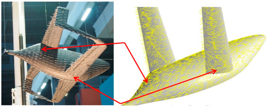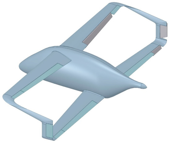 For verification of the predicted earlier aerodynamic characteristics, as well as for a deeper understanding of the boxplane local aerodynamics, we designed and built a wind tunnel model of this aircraft (Figure 1) and then fitted it with tufts for flow visualization. This is a model representing a very light two-seater piston engine pusher airplane with a boxwing and non-retractable tricycle landing gear. It does not possess a classical tail empennage. Rudders are located on the vertical fins at wing tips, while elevators and flaperons were mounted on the main wings (Figure 2).