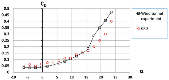 Computed drag coefficient CD versus wind tunnel data.