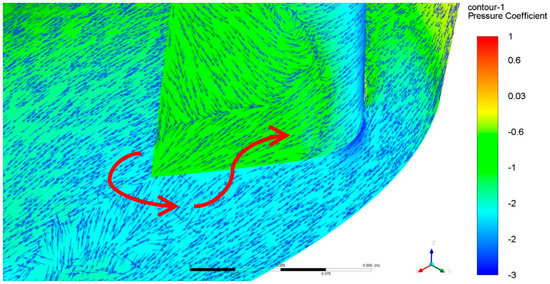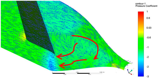 An insight into the wing–fuselage interference can be provided by CFD pressure coefficient distribution (Figure 8: velocity vectors below indicate flow directions; vector lengths are normalized to show the flow direction). Low pressure on the suction side of the wing is extended towards the body, leading to a strong adverse pressure gradient on the fuselage part adjacent to the wing root.