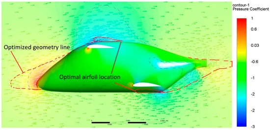 Pressure and velocity data on the aft body indicate a similar pattern (Figure 9), where the origin of adverse gradients can be traced to a low-pressure area just beneath the low wing trailing edge. The reason why this low-pressure area formed beneath the wing (where a higher pressure is expected instead) is due to the abrupt change in the aft body line, where a sharp angle leads to accelerating the flow. In this regard, streamlining the aft body is done either by increasing its aspect ratio and/or relocating the lower wing closer to its bottom for achieving a positive interference where a higher pressure beneath the airfoil will be shifted towards the adjacent body surface.